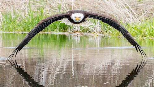 Bald eagles can soar over 10,000 feet high, and their great eyesight lets them see fish up to a mile away. When they attack, they drop down at up to 100 miles an hour! Then they glide just above the water, snag a fish with their feet, and fly off to eat it.